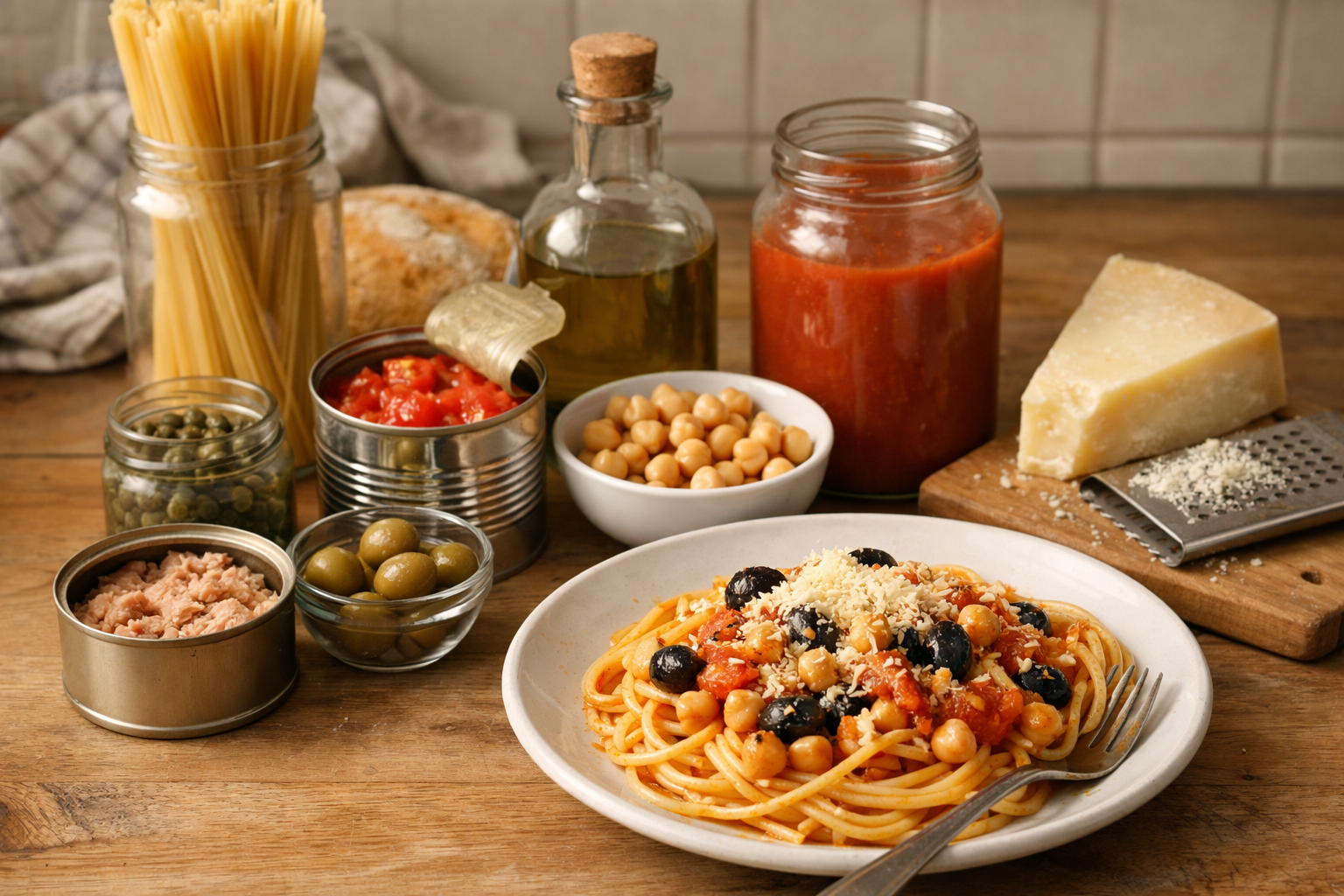 Z takiego zestawu da się zrobić zaskakująco dużo. Makaron z szybkim sosem pomidorowym i tartym serem. Grzanki z ciecierzycą rozgniecioną z oliwą i musztardą. Sos z tuńczykiem, pomidorami i kaparami. Nawet zwykłe pieczywo z oliwą, serem i oliwkami może być bardzo przyzwoitą kolacją, jeśli składniki są dobrze dobrane i nie udają niczego więcej.