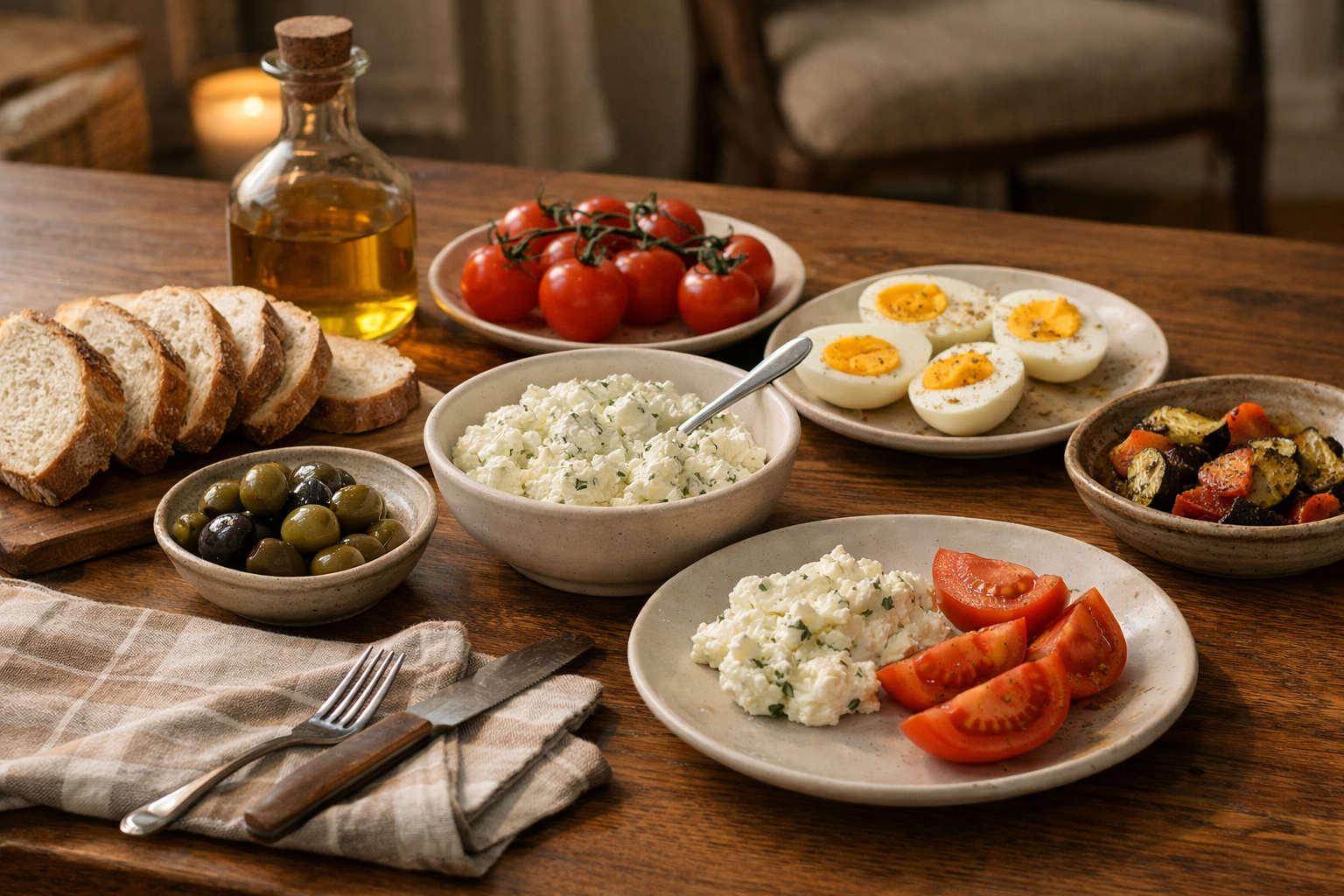 Czasem najlepsza kolacja to nie jeden „talerz”, tylko kilka prostych rzeczy podanych razem: pieczywo, ser, pomidory, oliwki, twarożek, ogórek, jajka. To szczególnie dobrze działa, kiedy je się z kimś i nie chce się stać przy kuchence.